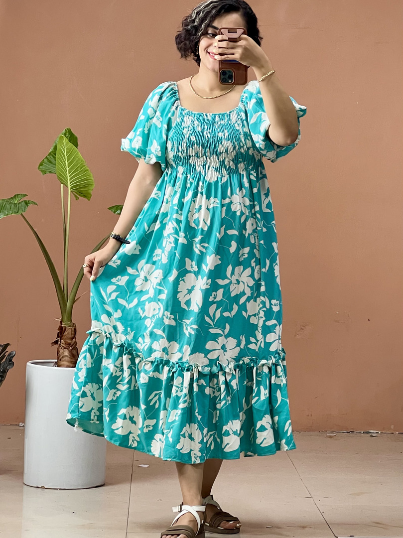 استایل ساحلی: رنگهای روشن این لباس بهخصوص مدل فیروزهای، برای عکاسی و قدمزدن کنار ساحل بسیار مناسب است.